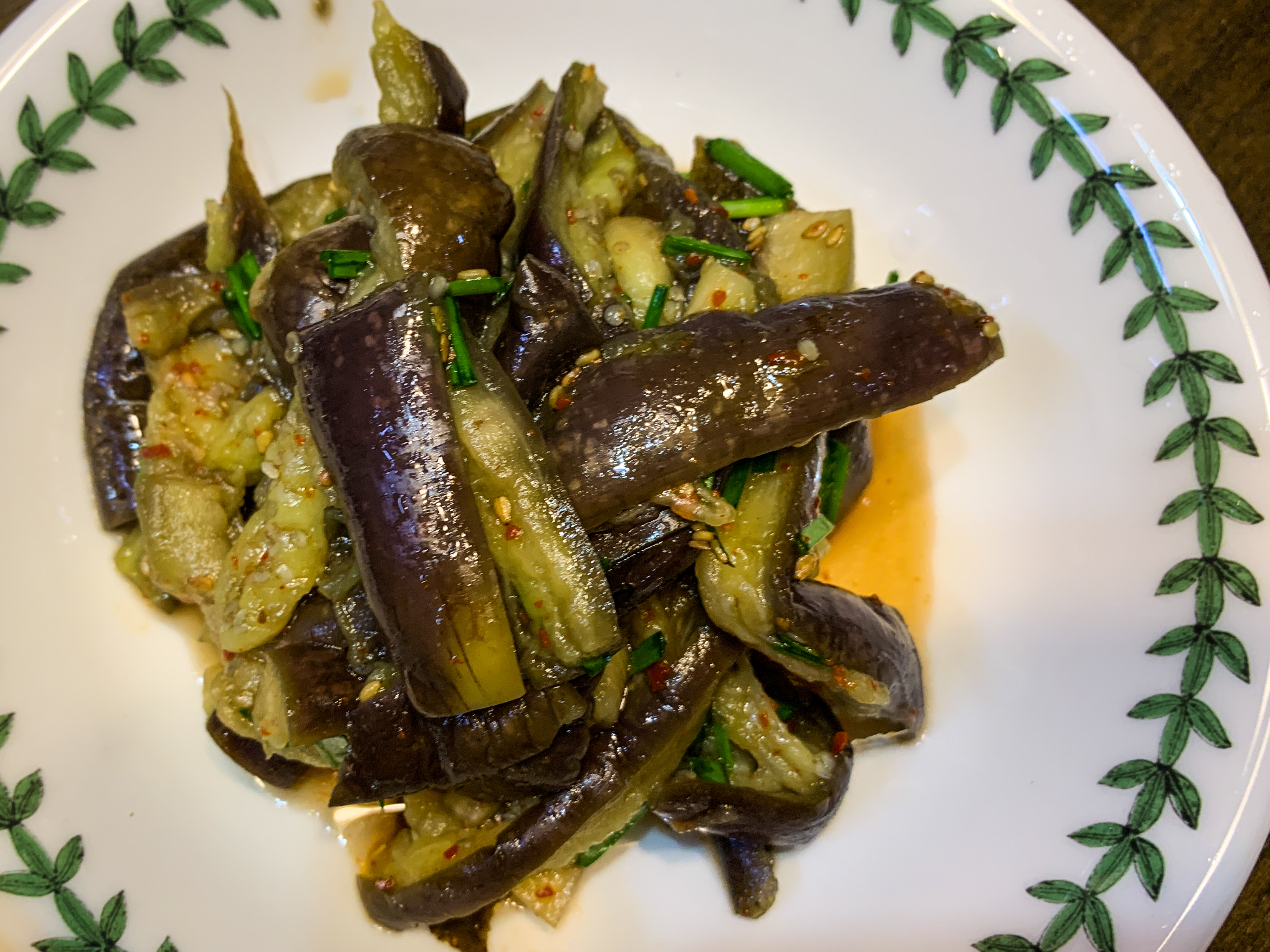 가지를 기름에 바로 넣으면 기름을 과하게 흡수합니다. 그래서 저는 먼저 팬을 충분히 달군 뒤 오일을 넣고 바로 가지를 투입합니다. 이렇게 하면 표면이 빠르게 코팅되어 기름 흡수가 줄어듭니다.